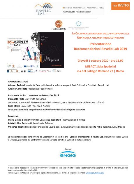 Roma 1 ottobre 2020: Presentazione Raccomandazioni Ravello Lab 2019
